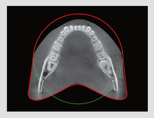 El innovador campo de visión del i3D Smart proporciona un volumen en forma de arco, que muestra una vista más amplia de la dentadura en comparación con otros dispositivos del mismo campo de visión. Para los terceros molares impactados, hay una alta probabilidad de que el volumen omita esta importante anatomía. El "volumen en forma de arco" de i3D Smart elimina esta posibilidad y proporciona al médico toda la dentadura necesaria para un diagnóstico completo.